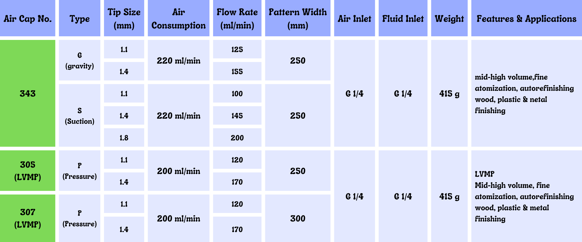 1. G – S type : needle valve full open at 0.2 MPa (Air inlet pressure) / Viscosity : 13 sec/#4FC